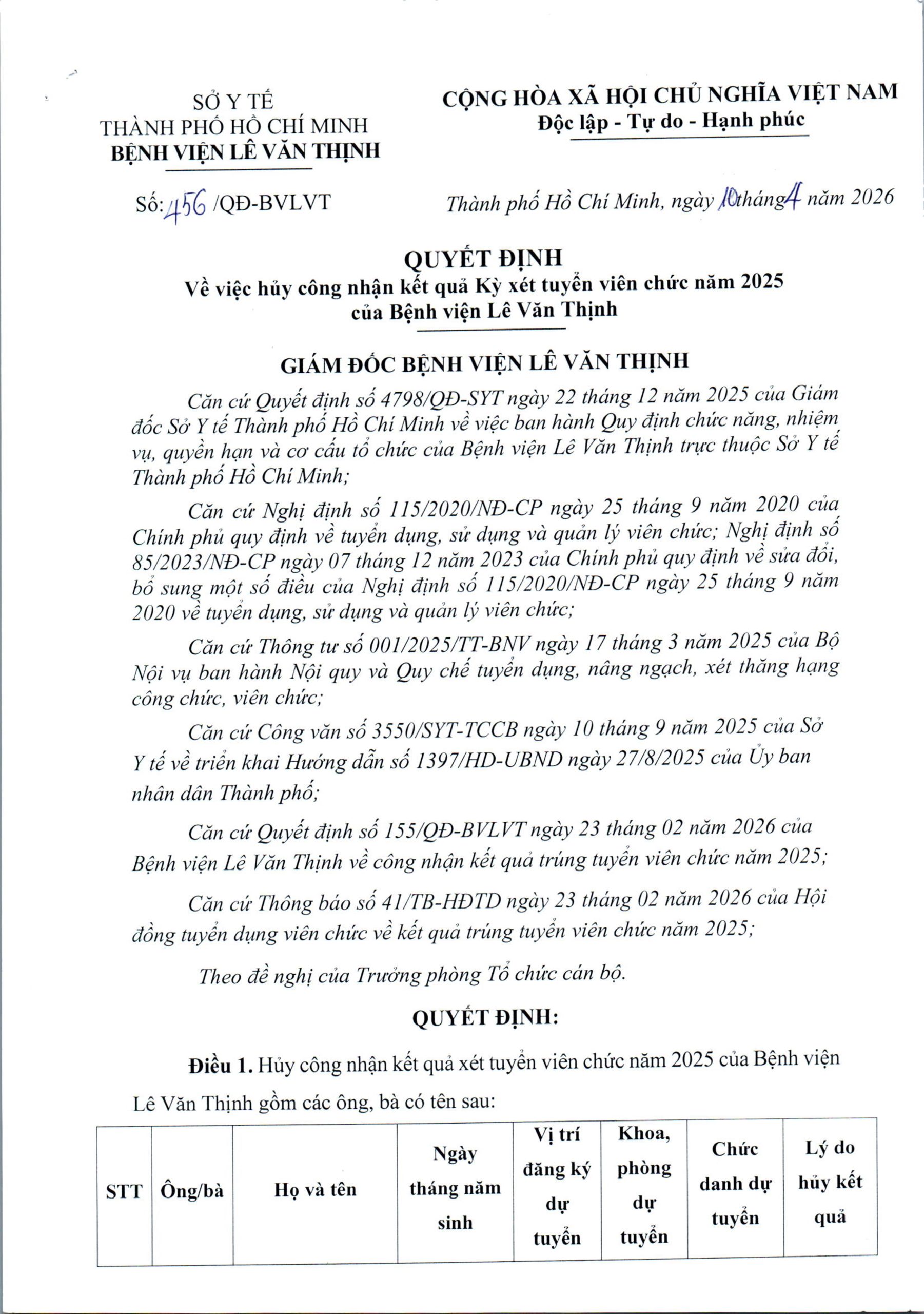 Cơ Hội Nghề NghiệpTin TứcQuyết định huỷ kết quả trúng tuyển Kỳ xét tuyển viên chức năm 2025 của Bệnh viện Lê Văn Thịnh10 Tháng Tư, 2026 Quyết định hủy Kết quả Kỳ xét tuyển viên chức của Bệnh viện Lê Văn Thịnh Thông tin chi tiết Quyết định: Tại đây. Lượt Truy Cập: 59
